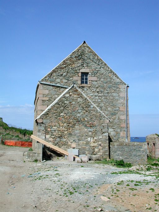 Vue du pignon est. Des traces subsistent sur la partie haute du pignon : restauration de la voûte par l'extrados, surélévation : ? Une grande baie donne de la lumière sur le côté le moins exposé aux descentes ennemiesImmatriculation