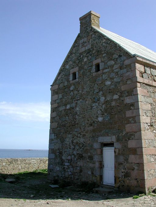 Vue du pignon ouest. Faisant directement face à la porte commandant l'accès à la cale, ce pignon se distingue par l'étroitesse de ses ouvertures : baies pour les combles aménagés pouvant servir au besoin de créneaux de mousqueterieImmatriculation