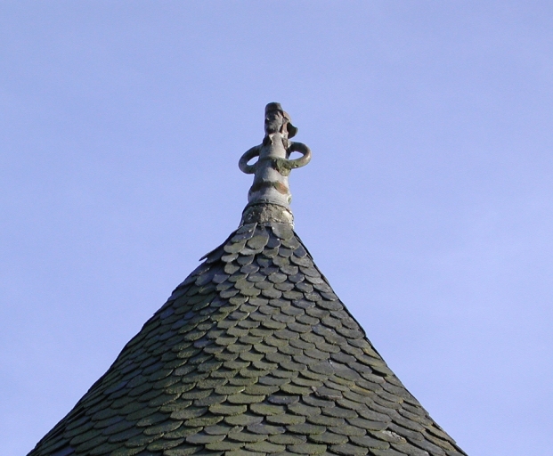 Vue détaillée de l'épi de faîtage.Immatriculation