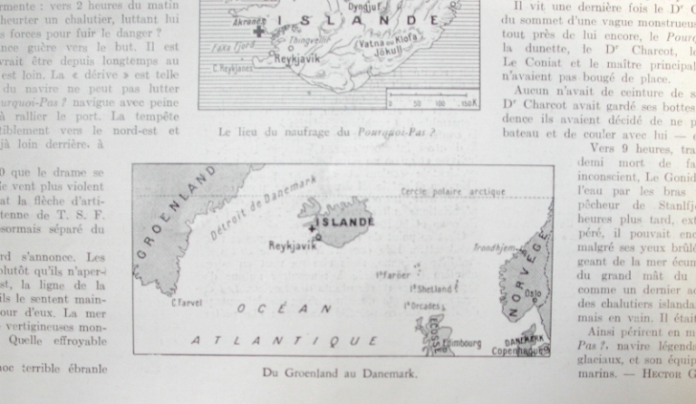 Dans : "L'Illustration", 26 septembre 1936, p. 91.Photographie : carte du Groenland au Danemark, avec le lieu du naufrage du "Pourquoi-Pas".