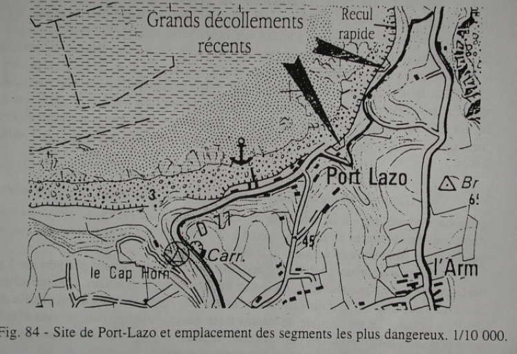 Dans : "Rapport sur les risques liés à l'évolution du littoral entre Penvénan et Plouha, SMVM Trégor-Goëlo"/ Jean-Pierre Pinot, Brest, UBO, 1997, p. 97.Photographie : carte IGN. Site de Port Lazo, fig. 84.
