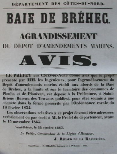 Affiche : avis d'agrandissement du dépôt d'engrais marins, Bréhec, 1863Immatriculation