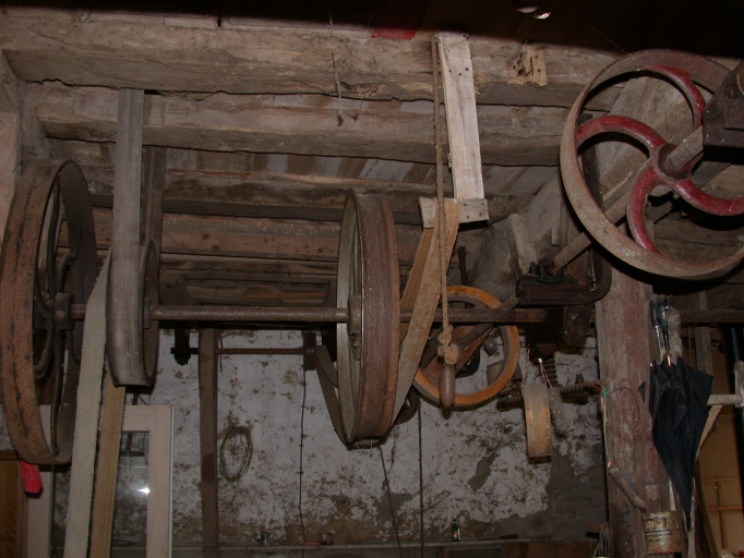 Vue intérieure, détail des courroies de transmission et des poulies.Immatriculation
