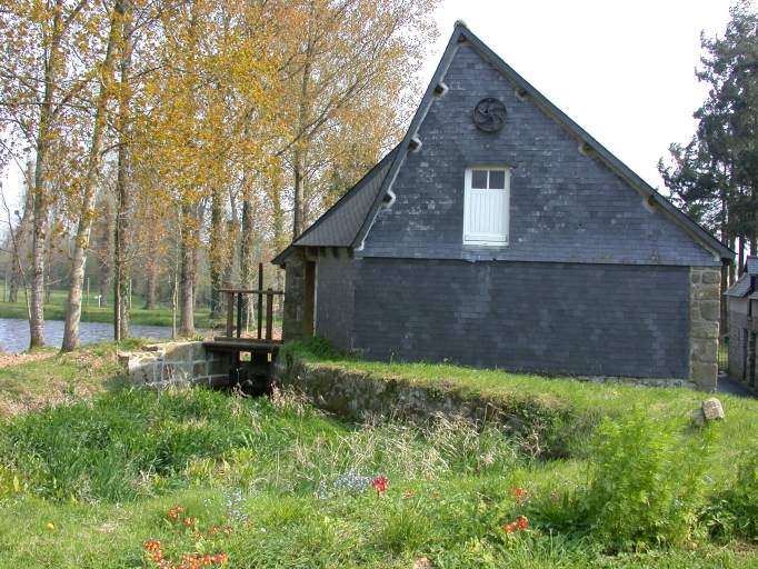 Pignon ouest du moulin, vanne motrice et traces de l'ancien bassin de retenue, aujourd'hui asséché.Immatriculation