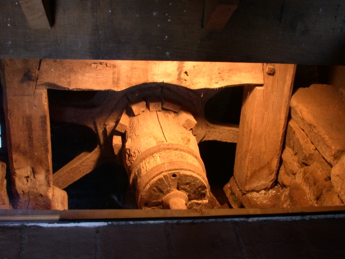 Vue intérieure du moulin : arbre d'une des deux roues subsistant.Immatriculation
