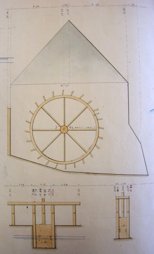 Elévation du moulin, de la roue hydraulique et de la vanne motrice (16 avril 1863).Immatriculation