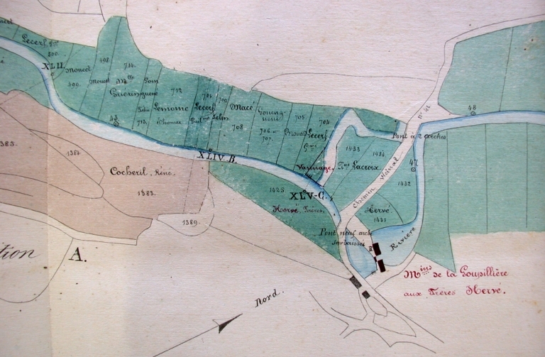 Plan de situation extrait du dossier de réglement d'eau des moulins de la Goupillière (25 janvier 1859).Immatriculation