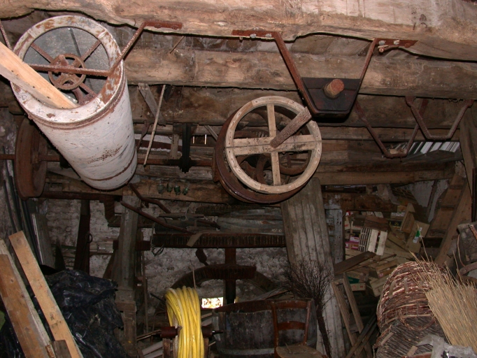 Vue intérieure du moulin est où il subsiste notamment un séparateur (en haut à gauche).Immatriculation