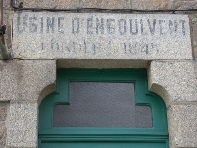 Inscription sur le linteau qui surmonte la porte d'entrée du magasin : Usine d'Engouvent fondée en 1845.Immatriculation