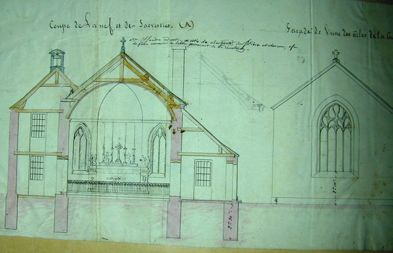 Clohars-Carnoët, église paroissiale Notre-Dame : coupe de la nef et de la sacristie par Joseph Bigot, 1841. Etat avant transformation (A.E. Quimper, 8 L, fonds Bigot), reproduction de 2002Immatriculation