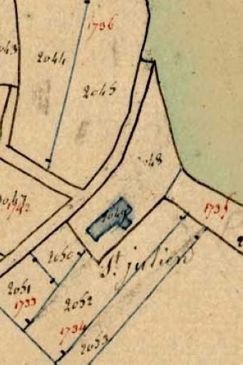 Bas Pouldu. Emplacement de la chapelle Saint-Julien. Extrait du cadastre de 1823, section D3 (A.D. Finistère, 3 P 101)Immatriculation