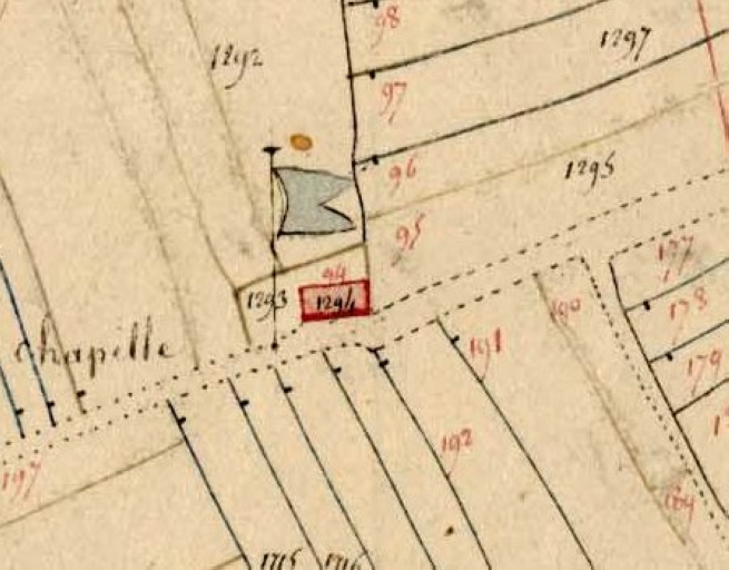 Entre Keruster et Kerguélen. Emplacement de la chapelle Saint-Gurloës (ou Saint-Eutrope), disparue. Extrait du cadastre de 1823, section E2 (A.D. Finistère, 3 P 101)Immatriculation