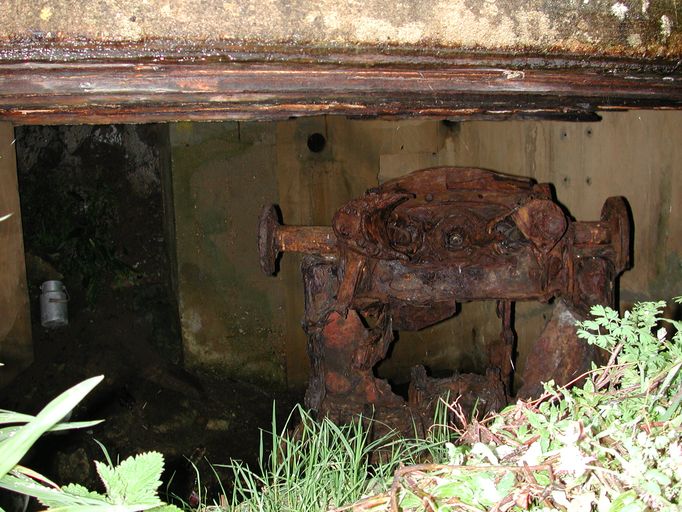 Vue de la chambre de tir depuis l'embrasure : le canon antichar de 5 cm KwK L/39 est en place (état en 2002). Le canon a été saboté en août 1944Immatriculation