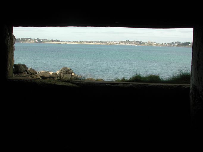 Vue générale de l'embrasure de la casemate de la pointe de Perharidi, en arrière plan l'Ile de BatzImmatriculation