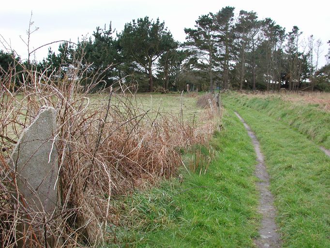 Vue du chemin d'accès de l'ensemble fortifié de la pointe Saint-Samson, les bornes en béton et piquets délimitant les champs de mines sont toujours à leur plaçe d'origineImmatriculation