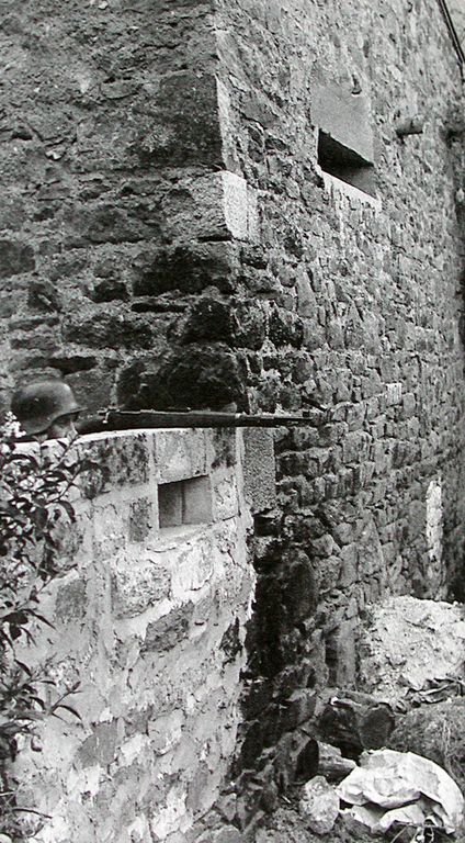 Vue d'un soldat armé d'un fusil Mauser derrière le mur défensif flanquant la Grève Blanche à Carantec (collection particulière). Dans les deux murs, on peut voir deux créneaux de tir. Il s'agit d'une photographie de propagandeImmatriculation