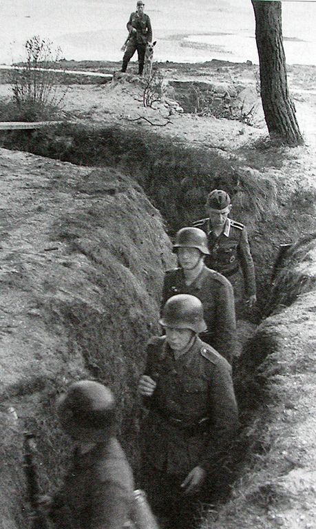 Vue d'une patrouille de soldats dans une tranchée de communication (collection particulière). En arrière-plan (derrière le soldat accompagné d'un berger allemand), on aperçoit le début de la Passe aux Moutons menant à l'île Callot. ll s'agit d'une photographie de propagandeImmatriculation