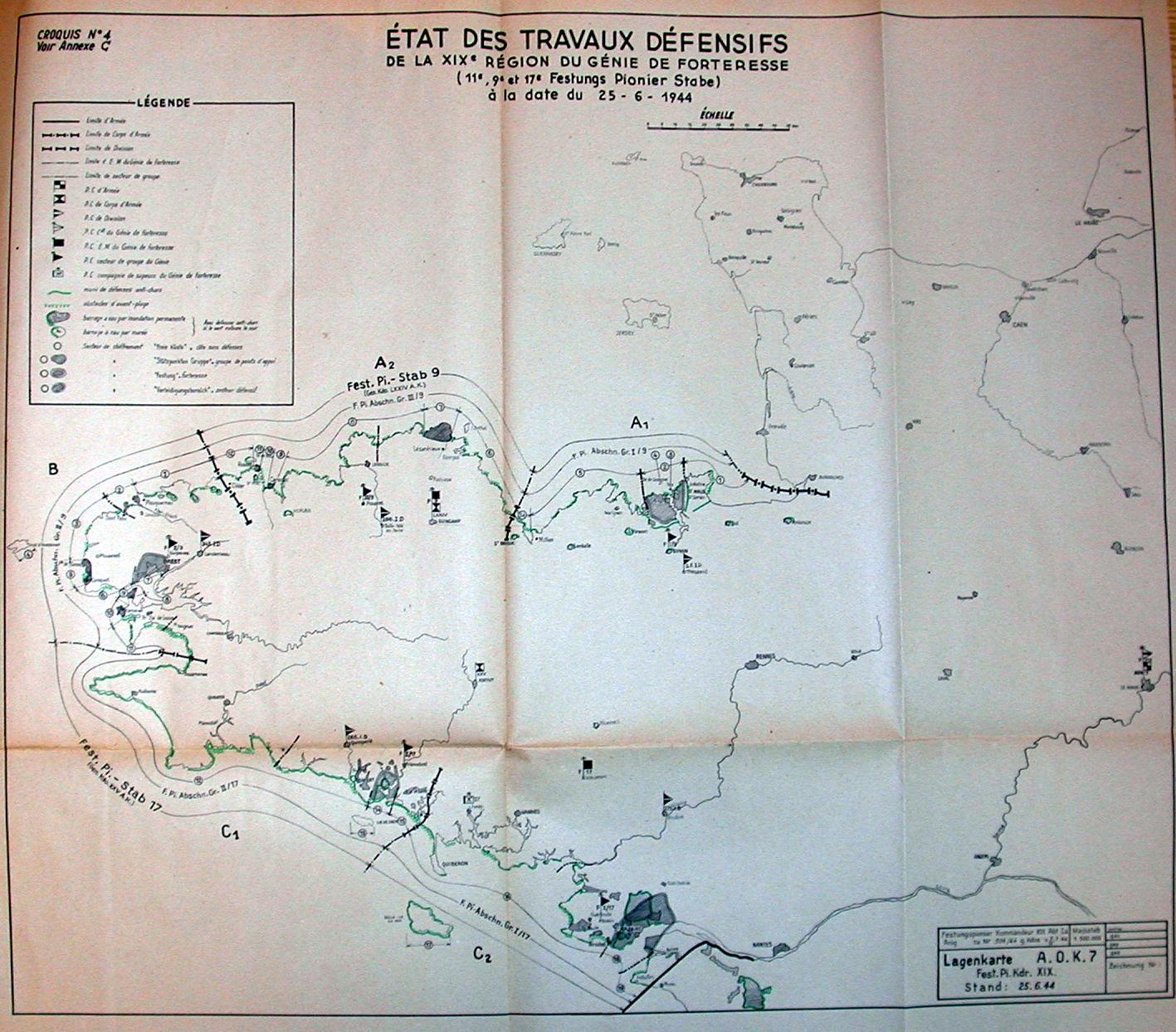 État des travaux défensifs de la XIXe région du génie de forteresse (11e, 9e et 17e Festungs Pionier Stabe) à la date du 25 juin 1944, croquis n° 4 (voir annexe C)Immatriculation