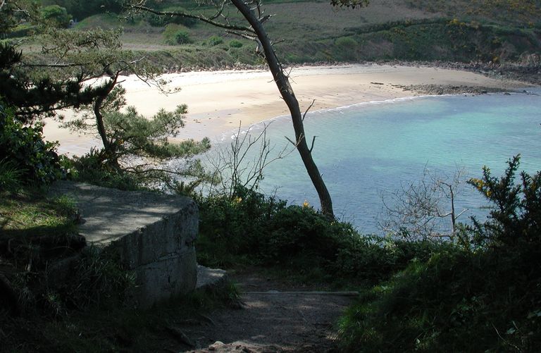 Vue d'ensemble du Tobrouk sous masque de la pointe du Cosmeur, en arrière plan, la plage du CosmeurImmatriculation
