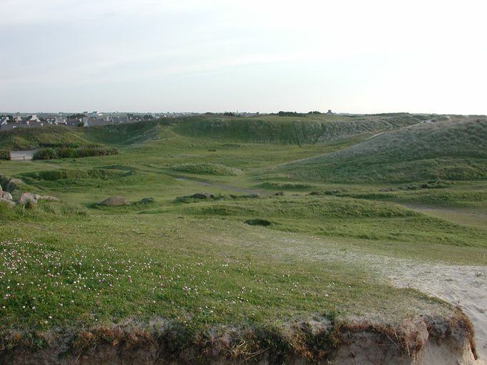 Cléder : vue de l'emplacement d'un camp allemand près du corps de garde des Amiets. La présence allemande a marqué le relief : épaulements en terre, chemins, emplacements des cantonnements, cratèresImmatriculation