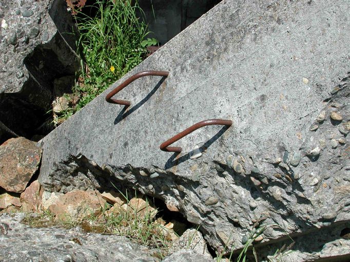 Vue des vestiges de l'abri type tôle métro de Beg an Fry : les barreaux de l'échelle menant à la terrasseImmatriculation