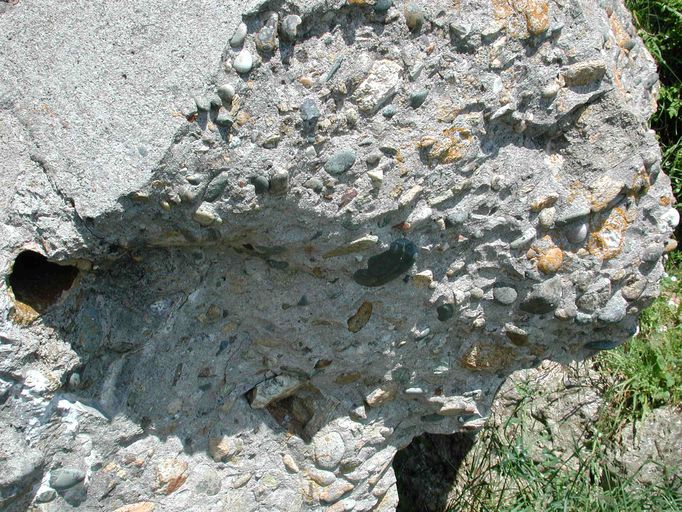 Vue des vestiges de l'abri type tôle métro de Beg an Fry : une coupe du blockhaus, par économie, galets, graviers et rocailles ont remplacé le ferraillageImmatriculation
