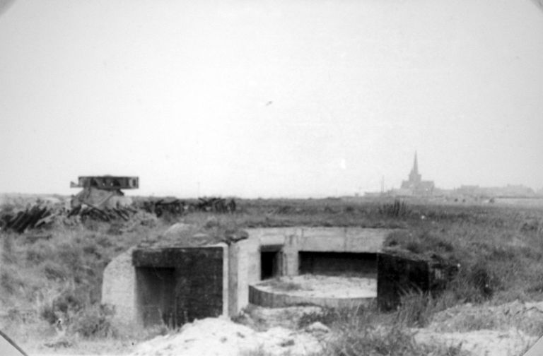 Vue de l'ensemble fortifié, station de repérage radar de la Clarté, Mez Gouet : au premier plan un encuvement pour pièce de 20 mm, en arrière plan, un radarImmatriculation