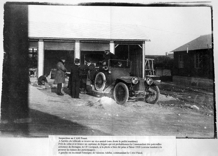 Vue des garages à l'occasion d'une inspection au centre d'aviation maritime de la Penzé, d'après la collection Daniel Dahiot, exposition maison prébendale de Saint-Pol-de-LéonImmatriculation