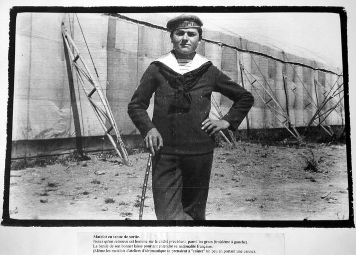 Matelot en tenue de sortie, en arrière plan : le système d'arrimage des hangars Bessonneau du centre d'aviation maritime, d'après la collection Daniel Dahiot, exposition maison prébendale de Saint-Pol-de-LéonImmatriculation