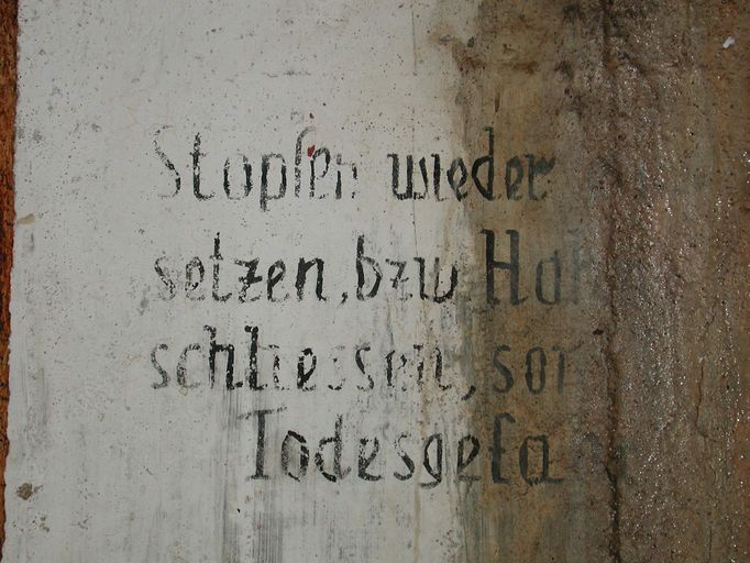 Vue de la peinture murale de la pièce de vie / chambre de troupe : marquage réglementaire pour l'usage du poêle de forteresse (état en 2002)Immatriculation