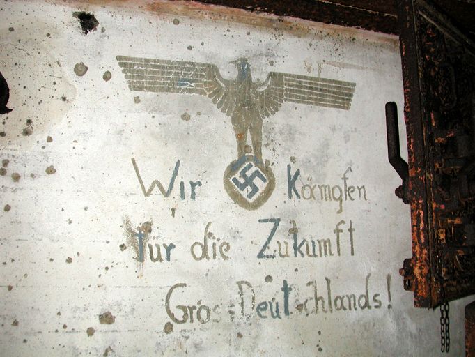 Vue de la peinture murale de propagande nazie située dans la chambre de tir (état en 2002)Immatriculation
