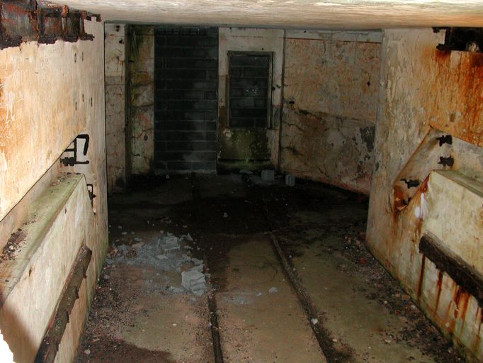 Locmaria-Plouzané, pointe du Grand-Minou : batterie de Toulbroc'h, abri de combat français du projecteur de 150 cm. Ce dernier a été transformé en poste de direction de tir par les allemands, vue intérieureImmatriculation