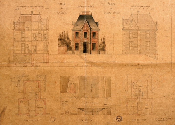 Octroi de Châtillon, élévations, plans et coupes, dessin, par Jean-Baptiste Martenot, 1862 (A. C. Rennes)Immatriculation