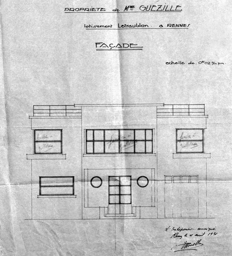 Elévation de la maison construite en 1931 par l'entrepreneur Novello (A. C. Rennes)Immatriculation