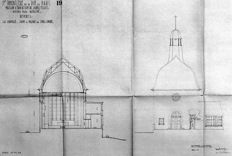 Chapelle, coupe et façade sur l'entrée, dessin, par H.-M. Delaage et Robin architectes, 1936 (A. C. Rennes)Immatriculation