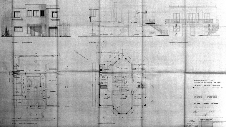 Elévations, plans et coupe de la maison rénovée par Jean Somson en 1968 (A. C. Rennes)Immatriculation