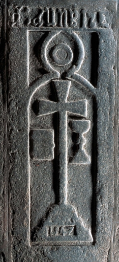 Vue générale : croix pattée, calice, livre, hostieImmatriculation