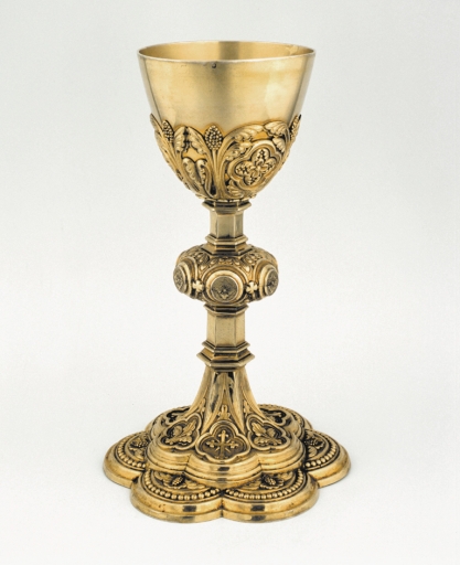 Chapelle d'orfèvrerie 1 : calice, patène, clochette, 2 burettes et leur plateau,