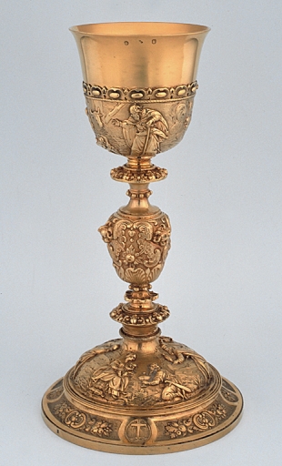 Chapelle d'orfèvrerie dans sa boîte : calice, patène, 2 burettes et leur bassin, clochette,