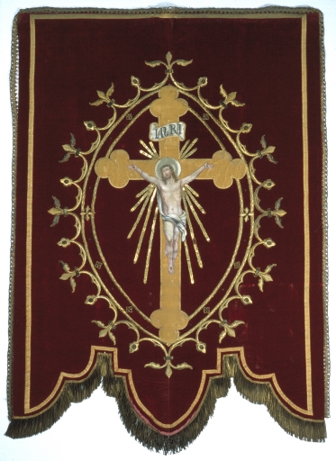 Bannière de procession paroissiale : Christ en croix, saint Thurial et saint Eutrope,