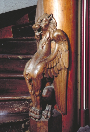 Monstre ailé à tête de lion, départ de l'escalier de la tourImmatriculation