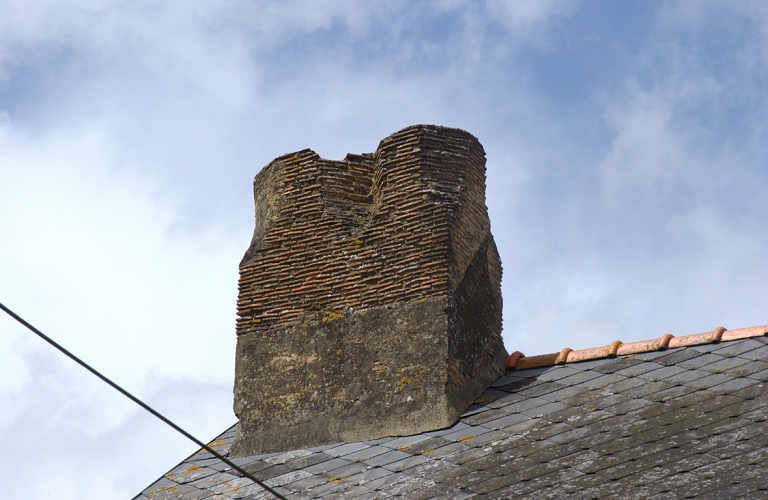 Logis, détail : souche double de cheminée et pierre d'angle, amorce d'un portailImmatriculation