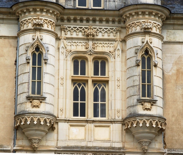 Château, détail des parties hautes, tourelles en encorbellementImmatriculation