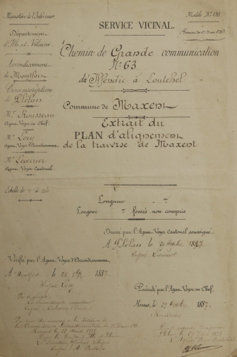 Légende du plan d'alignement dressé par l'agent-voyer Leverrier en 1887Immatriculation