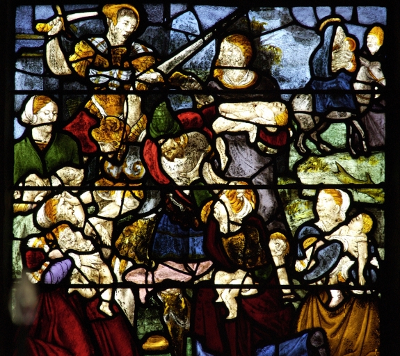 Verrière à personnages de la baie 3 : Paradis terrestre ; Enfance du Christ ; Baptême du Christ,
