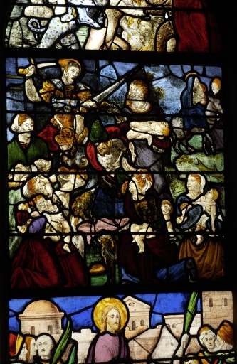 Verrière à personnages de la baie 3 : Paradis terrestre ; Enfance du Christ ; Baptême du Christ,