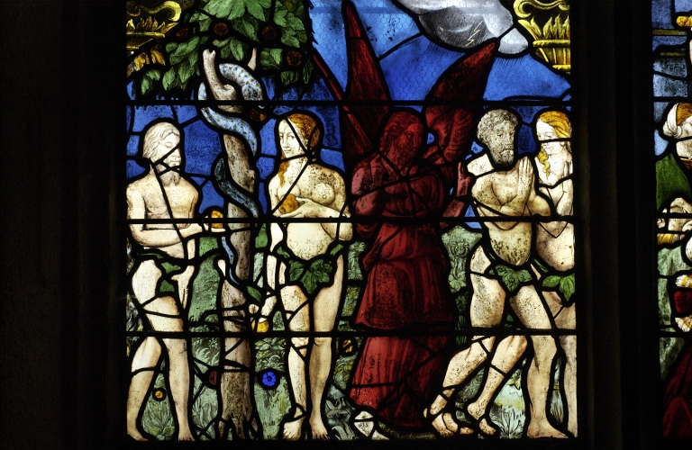 Verrière à personnages de la baie 3 : Paradis terrestre ; Enfance du Christ ; Baptême du Christ,