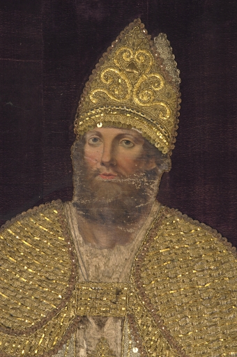 Bannière de procession paroissiale : Christ en croix, saint Germain,