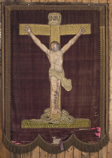 Bannière de procession paroissiale : Christ en croix, saint Germain,