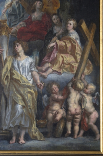 Détail de l'angle inférieur droit : ange thuriféraire et angelots portant la croixImmatriculation